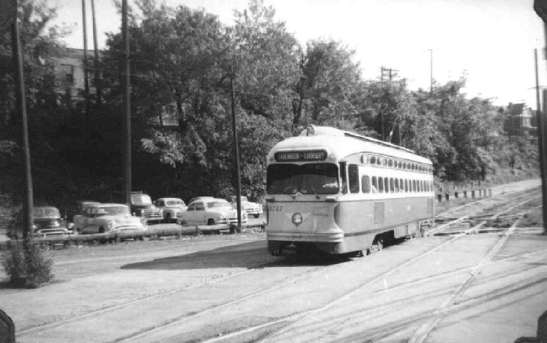 PCC car 1717 coming into South Hills Junction from Library as seen looking to the southwest. Based on the collection of cars in the parking lot, this photo was probably taken in the mid 1950s.