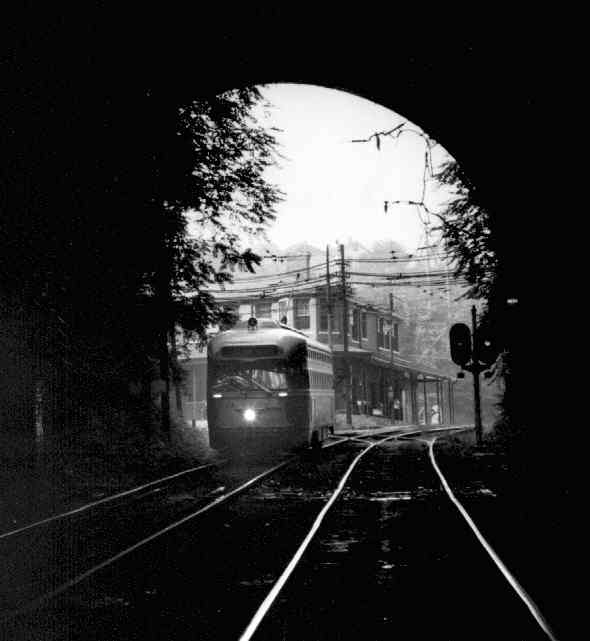 A Drake interurban car has just stopped at South Hills Junction and now heads from the sweltering heat of a July Sunday into the cool gloom of the trolley tunnel under Mount. Washington. Fred Schneider goes where others fear to tread, into the mouth of the tunnel. This picture was taken on a fan trip that Fred sponsored in 1958, so he could stop wherever he wanted.