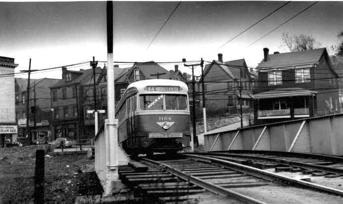 PCC 1164 on the through girder bridge at the entrance to South Hills Junction from the Knoxville line. The car just turned off Warrington Ave.