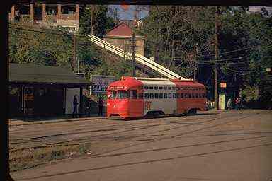 A dip-painted PAT 1700 glides past the shelter, stairs, and news stand at the junction in 1972. Cars headed for the Overbrook line stopped at the shelter - the yellow sign indicates this. Other cars stop at the news stand.