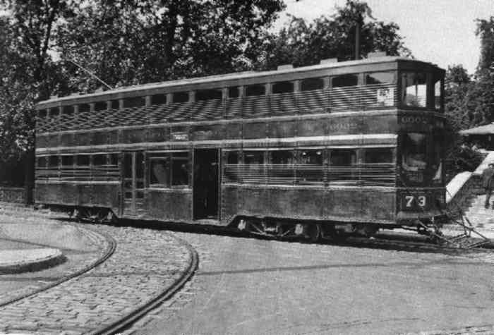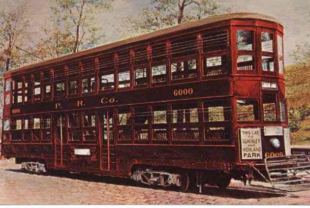 Double deck low floor cars. 47' 2" length over buffers, width 7' 10", height 13' 8", weight 38,700 lbs. Seating capacity 110. Arch bar 5'6" wb trucks with 4 Westinghouse 30 hp motors. The first car, 6000, was built in PRCo shops by from three summer cars. Originally 6000 was a trailer with an open upper level, but it was later enclosed and powered. Cars 6001 - 6006 were ordered from St. Louis Car Company in 1913. They were double end cars but never operated that way, they never were fitted with front poles. The Pennsylvania Trolley Museum has produced an eight page pamplet on these cars