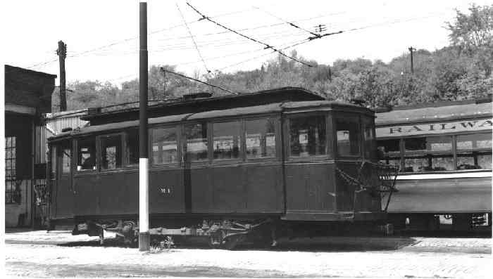 M1 at the Ingram Car House in 1954 with the security bars removed. The car already belonged to the Pittsburgh Electric Railway Club.