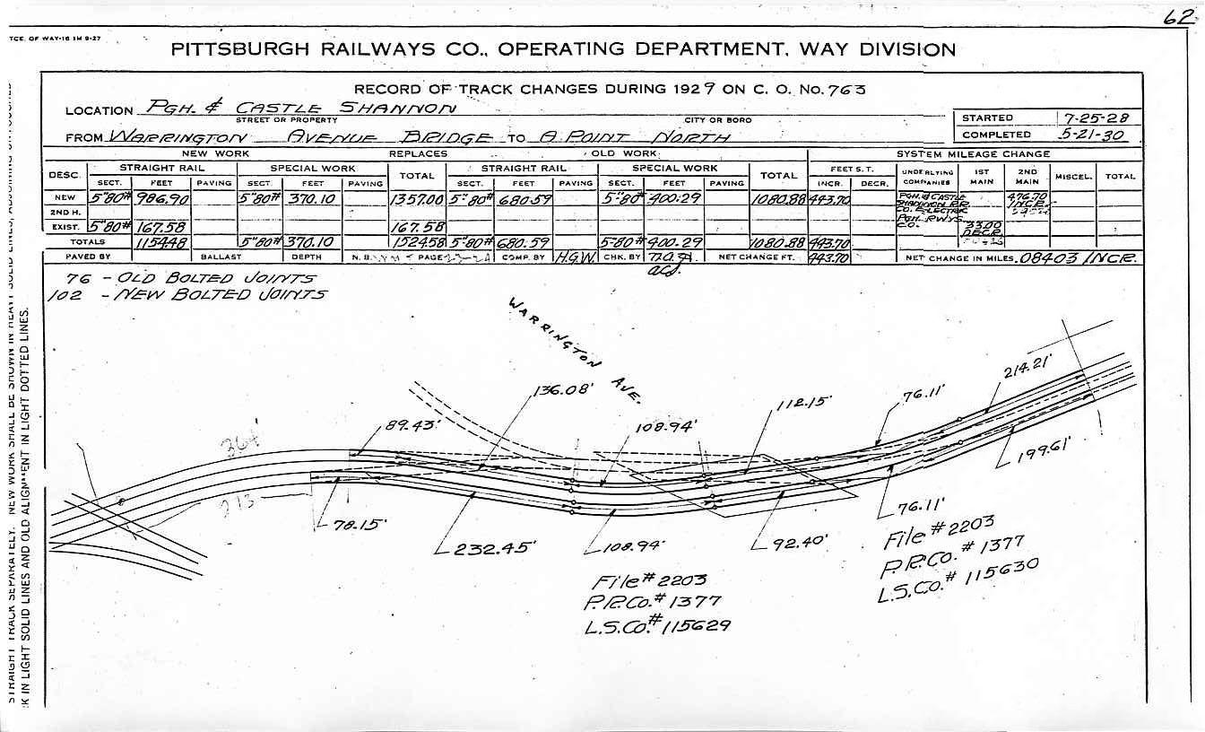 The comments on the left of the document indicate that dashed lines are removed track, heavy lines are new track, and light lines are old, remaining track.