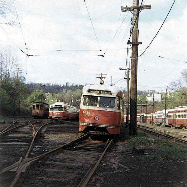 Once off the Palm Garden Bridge the street cars had a long, not too steep, climb up "Ravine St." past the South Hills Cars Shops and storage area. This is what might be called the eastern section of the yard. The switch onto the mainline was about 1/3rd the distance from the admin building to the Palm Garden trestle. Interurban 1616 sitting here was in the yard - the two tracks immediatly to the right of 1616 were the ones used by 38-39-42 cars. In the latter days of PRCo - 1955-1964 - the 1600 series interurbans were kept here as they only saw service in the rush hour - very rarely otherwise. It was unusual to see a 17 interurban here "on the east side" of the yard - they were kept on the western side for the most part. PCC cars at Palm Garden loop itself usually needed some kind of repair. There was a direct entrance into the yard from the Palm Garden Loop. A couple of the tracks on the left were stub end and had to be backed into from the ladder track in the foreground.