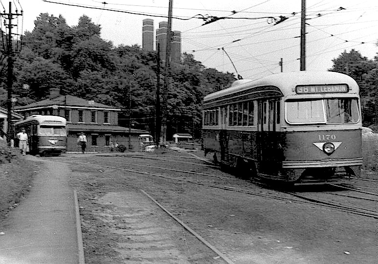 At one time, onto the 30's and maybe 40's, there was a outbound track that connected the main line directly to 40 Mt. Washington. Although a mystery for a time, this appears to be the original alignment of the 38-42 lines before the Overbrook line was connected in 1908. This outbound connection to 40 Mt. Washington remained intact for a number of years, the turnout was located further inbound that the junction of the 38-42 lines and seemed to run like a gauntlet for a distance before branching off. Eventually the connection to the main was removed and the track remained a stub on the outbound route 40 track until the junction was torn up. This track was used mainly for work cars that carried ties, rail, and sand. M-551, 701, and 211, (forerunner of 210), were staged there for the next day's run to Shannon, Charleroi, and/or Washington, PA. for maintenance chores. M1, the Pay car, sometimes made paydays on this stub. Also very clear in this picture are the overhead signaling switches.