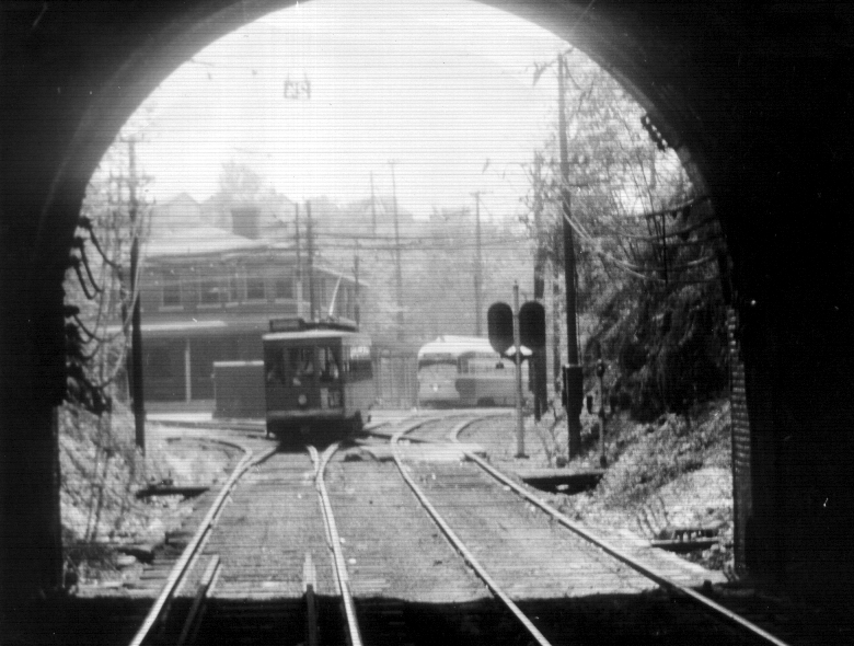 A Drake interurban car has just stopped at South Hills Junction and now heads from the sweltering heat of a July Sunday into the cool gloom of the trolley tunnel under Mount. Washington. Fred Schneider goes where others fear to tread, into the mouth of the tunnel. This picture was taken on a fan trip that Fred sponsored in 1958, so he could stop wherever he wanted.