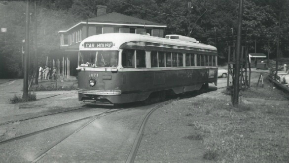 In the above 1956 photo the driveway from Warrington Ave. can be seen to still go behind the back track. In the early PAT era photo below the entire area has been paved so busses could be brought to the junction.