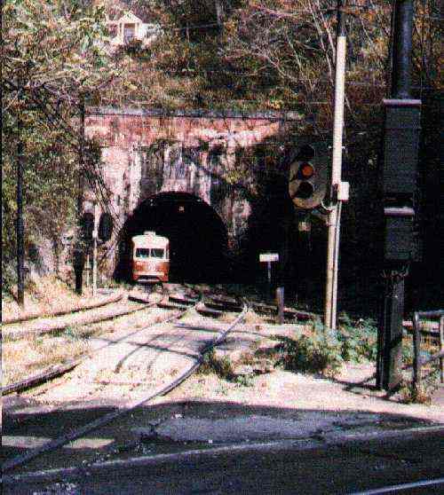On a very bright summer day a PCC emerges from the tunnel. The lime on the portal, the derail, signals, and switch gear all show up in this picture. It appears as though they installed a larger stopper than what was in place in 1946. The three aspect signals were part of the interlocking of the junction. The red, center, light stayed on as long as the derail was derailing. When a clear signal was received the yellow, bottom, light came on along with the red. Once the derail was pulled in red and yellow went out and the green, top, light came on; only then could the car proceed. The signal went back to red, and the derail reset, as soon as the car passed.